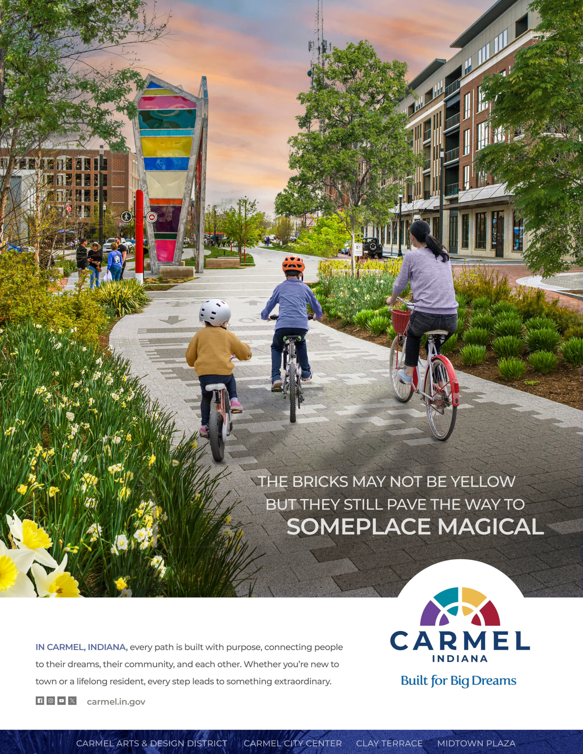 Carmel’s updated brand “Built for Big Dreams” summarizes its philosophy of creating an urban environment that has enough room for even the most fantastical thinkers. Modern and inclusive, the logo follows the rounded c-shape of the city’s preferred road infrastructure while imbuing it with the colorful diversity that makes everyone’s experience and contribution different. Of course, delivering on this brand promise requires the city’s commitment to convenience paired with ambition. The city provides unparalleled proximity and exposure to the best performances (at their state-of-the-art facility), works of public art (often housed on the roundabouts), and recreation opportunities (on their beautifully landscaped portion of the Monon Trail). Thus, Carmelites have every opportunity to fill the rest of the canvas with a life of their own design, a freedom which they translate into personal successes that uphold Carmel’s position on top ten lists.
